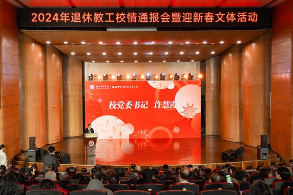 12月26日,2024年退休教工校情通报会暨迎新春文体活动在音乐厅举行。校党委书记许慧霞,党委副书记陈永华出席,全校退休教工,相关职能部门及二级学院负责人、分工会主席近300人参加。会议由陈永华主持。